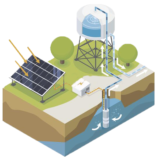 Solar water pumps are like conventional water pumps except that they are run on Solar energy. It can be a completely independent system without any other source or can be backed by another source like a grid.Solar Water Pumps are systems that pump water from a water source depending on the intensity of sunlight falling on the solar panels. In this system, the light falling on the solar panels gets converted to electricity and in turn, this electricity runs a motor to pump water from a water body. With the increase in the intensity of the sunlight during daytime, the amount of electricity produced also increases. This in-turn increases the output of the water pump.