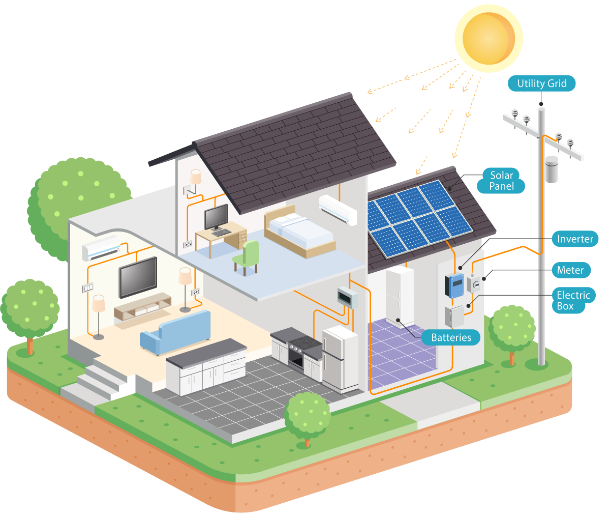 An off-grid system is not connected to the electricity grid and therefore requires battery storage. Off-grid solar systems must will generate enough power throughout the year and have enough battery capacity to meet the home’s requirements, even in the depths of monsoon when there is generally much less sunlight.